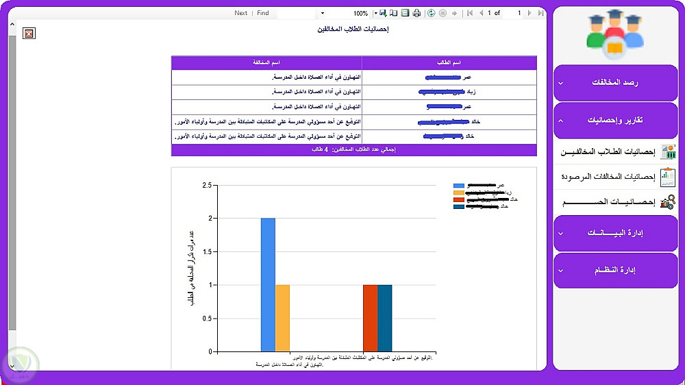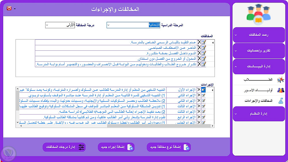 >>> رصد أي مخالفة سلوكية لأي طالب وتحديد مدى تكرارها.