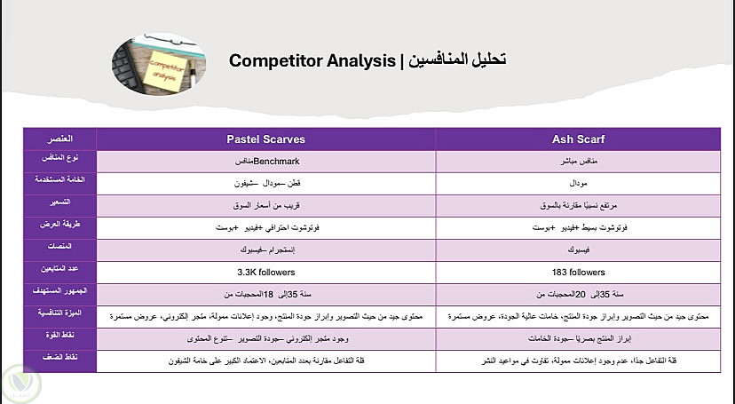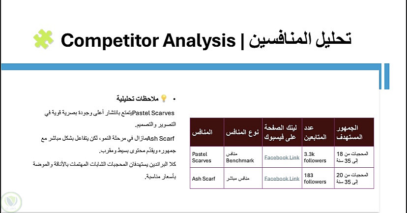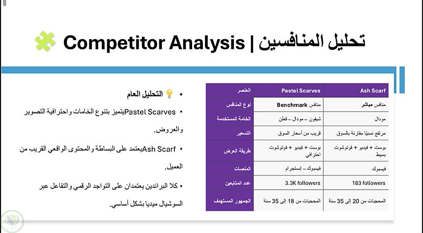 قمت في هذا المشروع بتنفيذ تحليل منافسين شامل لصالح براند، بهدف فهم وضع السوق وتحديد موقع العلامة التجارية بين المنافسين. شمل التحليل جمع وتقييم معلومات دقيقة عن نقاط القوة والضعف لدى كل منافس، بالإضافة إلى مقارنة الأسعار، جودة المحتوى، الهوية البصرية، أسلوب التواصل، ونوعية المنتجات.