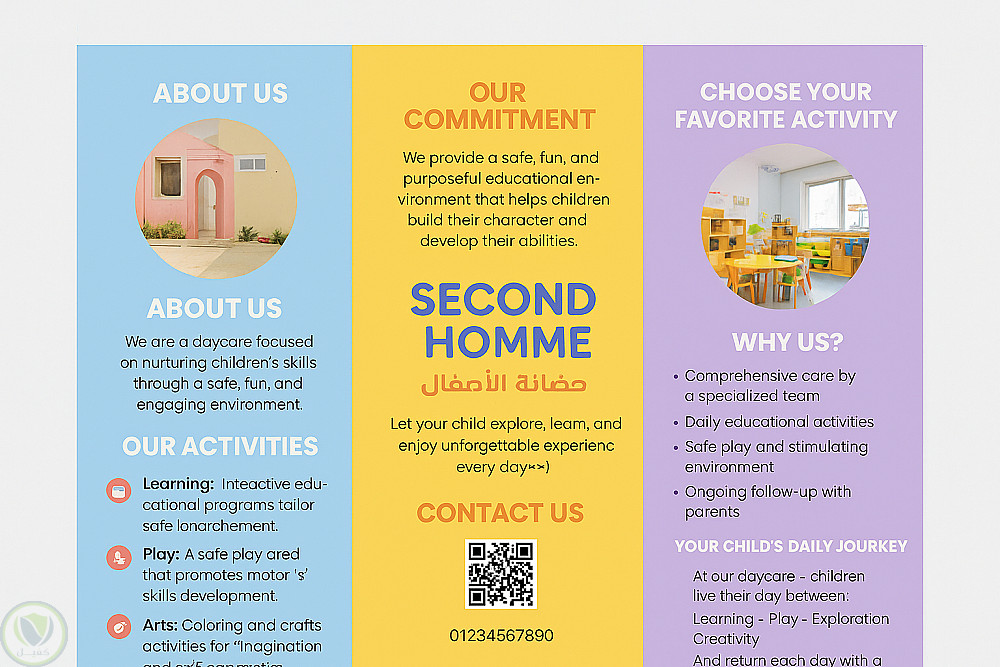 لقد قمت بتصميم برشور احترافي لحضانة الأطفال يشمل: