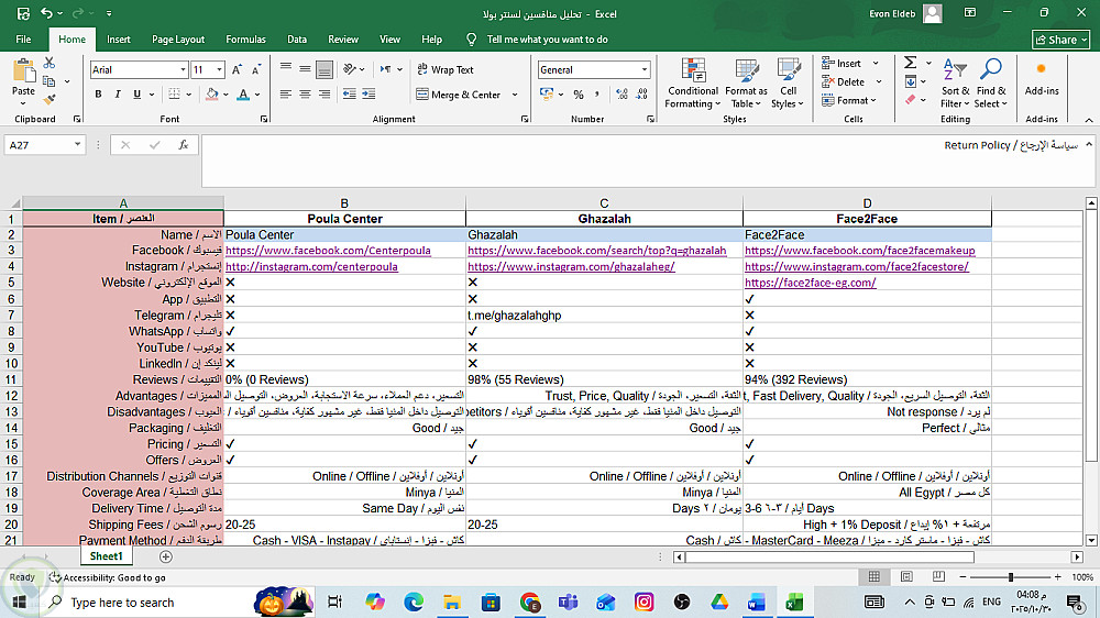 أنجزت تحليل منافسين تفصيلي لسنتر بولا لمستحضرات التجميل في المنيا بناءً على مقارنة فعلية مع أبرز منافسين في نفس السوق المحلي (Face2Face – Ghazalah).