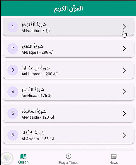 114 سورة كاملة مع عرض مواقيت الصلوات الخمس.