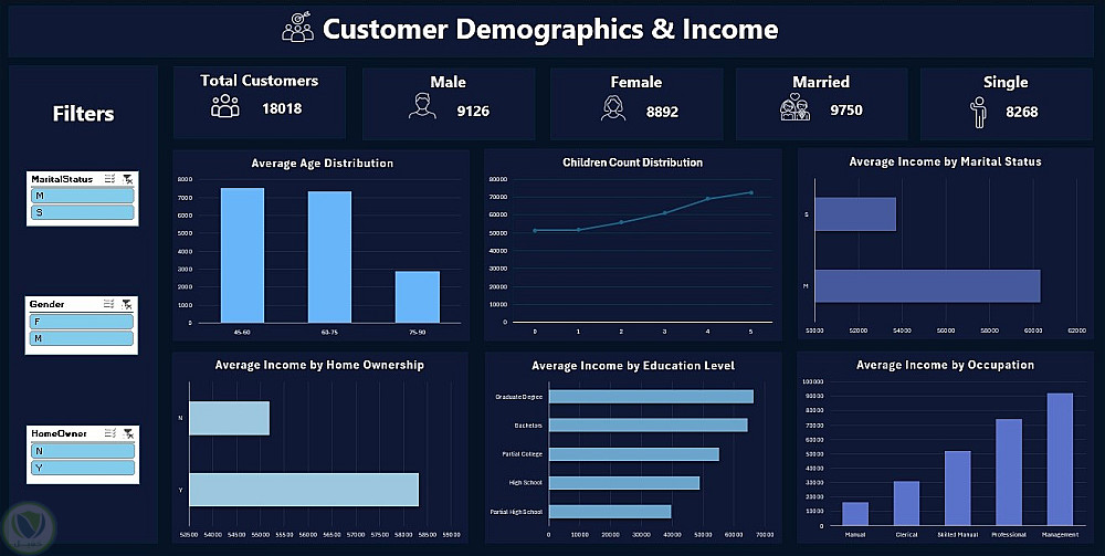 في هذا المشروع قمت بتنظيف وتحليل بيانات CSV باستخدام Python وExcel. بدأت باستكشاف البيانات بفحص أسماء الأعمدة وأنواعها، والكشف عن القيم المفقودة والتكرارات، وحذف عمود غير مهم (CustomerKey). ثم عالجت القيم المفقودة والأخطاء بحذف السجلات الفارغة وتوحيد الفراغات، وأنشأت عمودًا جديدًا FullName من دمج Prefix وFirstName وLastName، وحذفت الأعمدة الأصلية. صححت نوع البيانات بتحويل BirthDate إلى تنسيق تاريخ. بعد الحفظ بصيغة CSV، استوردت الملف إلى Excel للتحليل البصري، حيث حسبت مؤشرات الأداء مثل متوسط الدخل، نسبة النوع، ونسبة الحالة الاجتماعية. أنشأت Pivot Tables لتوزيع العملاء حسب التعليم والوظيفة وعدد الأطفال، وصممت Dashboard تفاعلي بستة رسوم توضح توزيع الدخل، التعليم، الوظائف، الملكية، النوع والعمر، وعدد الأطفال. النتيجة ملف Excel متكامل وواضح لاتخاذ القرارات بسرعة.