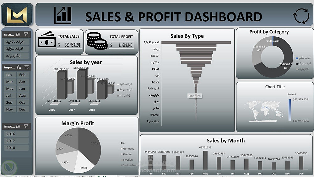 توضيح للنسب الربحيه للمنتجات - توزيع المبيعات الشهري خلال السنه - توزيع المبيعات حسب المناطق والدول.
