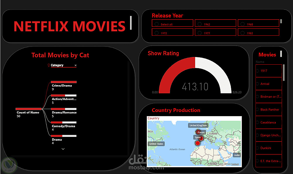 dashboard باستخدام ال Power Bi لتوضيح افلام قنوات الNetflex وانواعها اللتي تنحصر في دراما وكوميدي و رومانسي الخ .....
