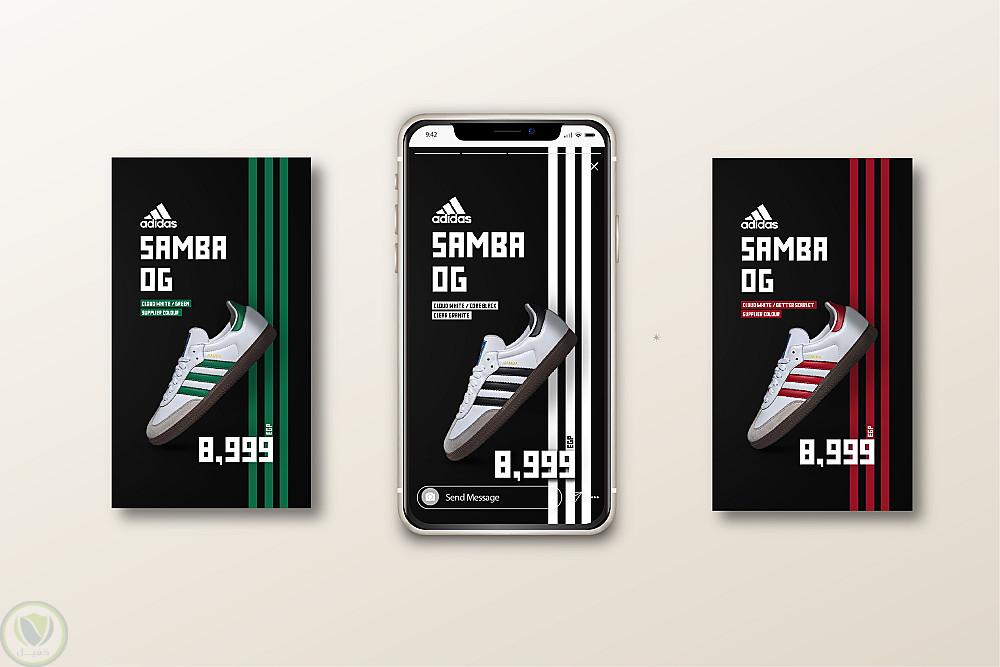 تصميم دعائي احترافي لحذاء Adidas Samba OG الكلاسيكي، يركز على إبراز هوية العلامة التجارية من خلال استخدام الألوان المميزة (الأبيض، الأسود، الرمادي).