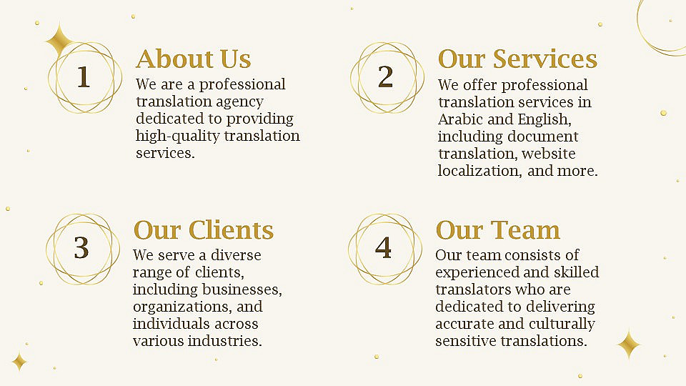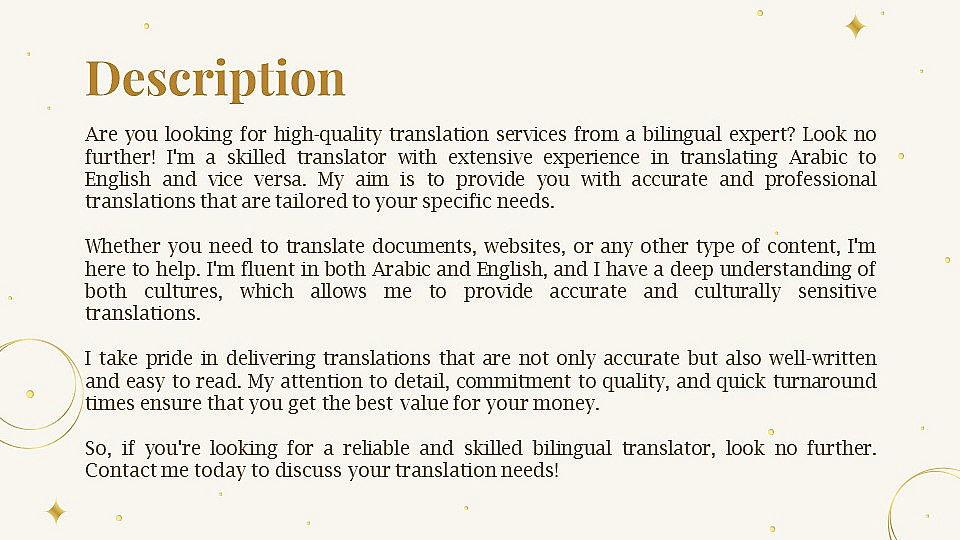 سواء كنت بحاجة إلى ترجمة مستندات أو مواقع الويب أو أي نوع آخر من المحتوى، فأنا هنا للمساعدة. أنا ملم باللغتين العربية والإنجليزية ولدي فهم عميق لكلا الثقافتين، مما يتيح لي تقديم ترجمات دقيقة وحساسة للثقافة.