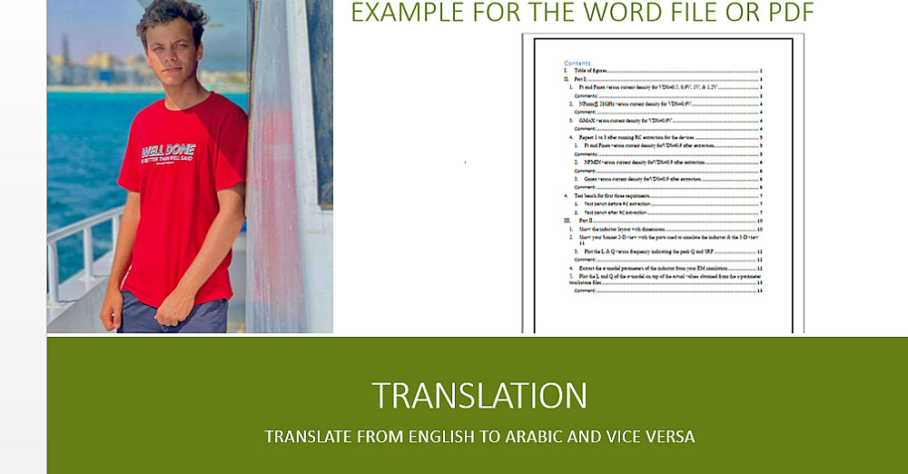 لقد عملت على ترجمة مجموعة واسعة من المواد والمحتويات، بما في ذلك المواد الإعلانية والتسويقية والتقنية والطبية والقانونية والأدبية وغيرها الكثير. وقد قمت بترجمة الكتب والمقالات والدليل التقني والمواد التعليمية والكتيبات وغيرها.ترجمه 1000 كلمه من اللغه العربيه الي الانجليزيه والعكس مقابل 5 دولار
