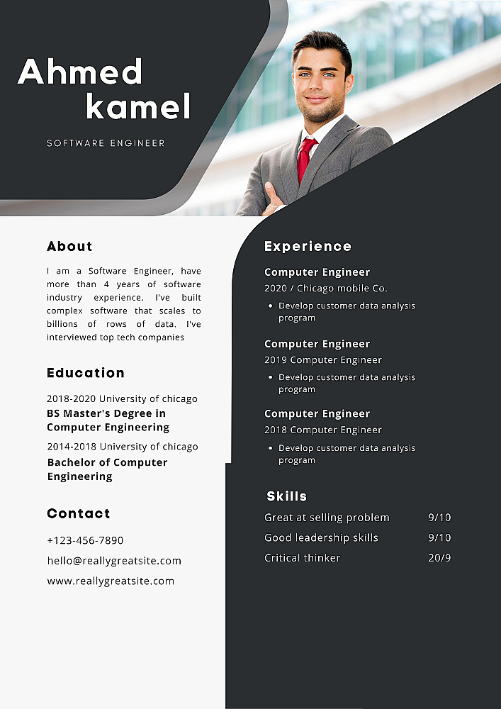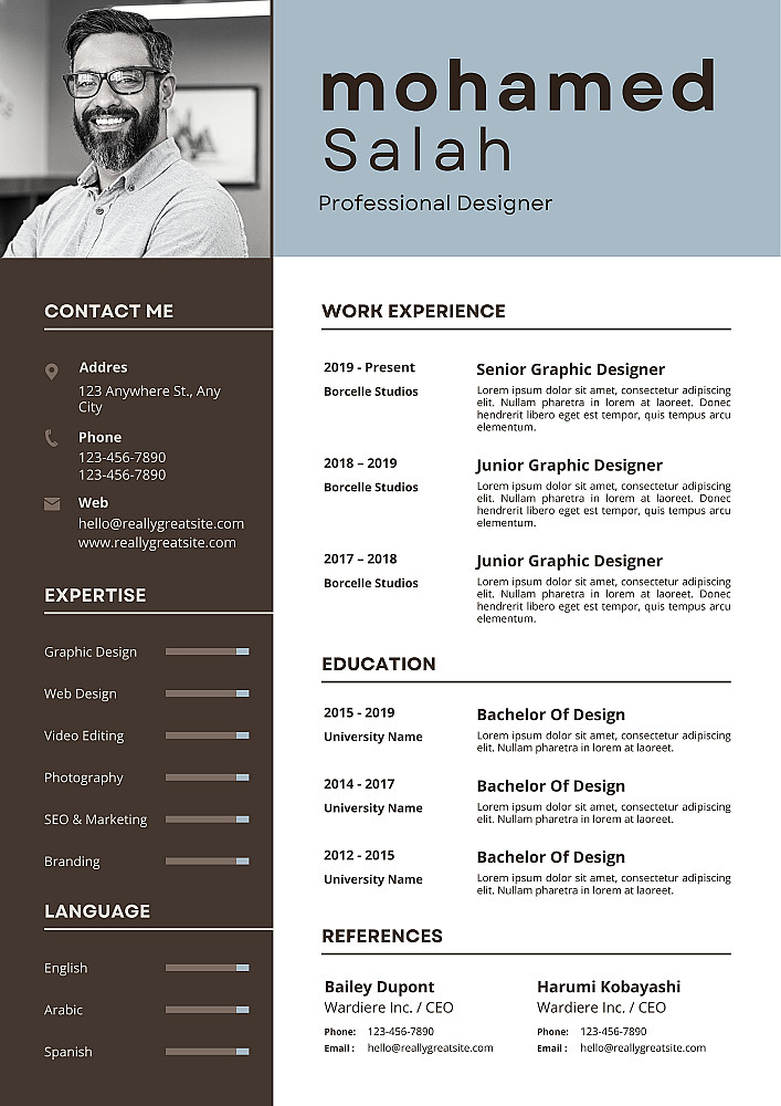 خدمتي لك هي تصميم سيره ذاتيه بطريقه احترافية وحديثه وبأي لغة من اللغات