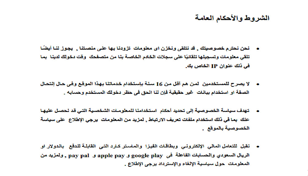 الشروط والأحكام العامة وسياسة الإستخدام وسياسة الخصوصية وسياسة الدفع والإلغاء والإسترداد والضمان و التعريف بمقدم الخدمة ( من نحن ) وككافة ما طيلبه المشتري من صيغ محددة فى ذات المجال