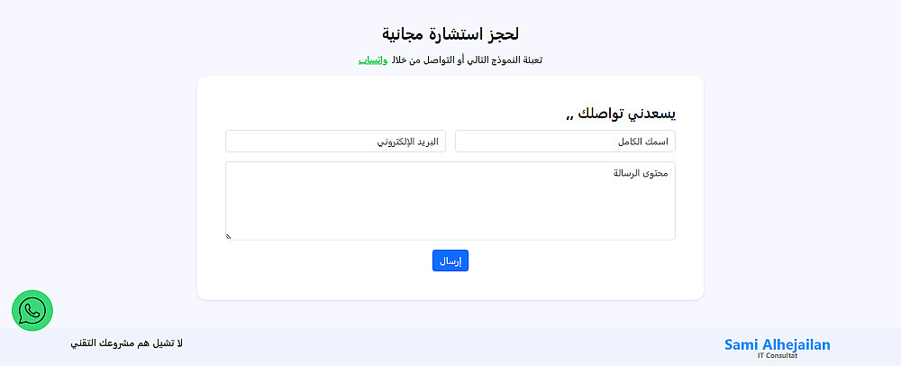 مع وجود form لتواصل معك وايضا whatsApp ايقون لضمان تواصل سريع معك
