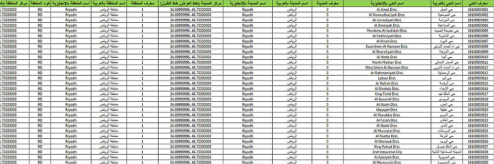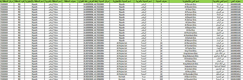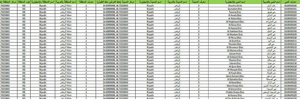 معرف الحي - اسم الحي بالعربية - اسم الحي بالإنجليزية - معرف المدينة - اسم المدينة بالعربية - اسم المدينة بالإنجليزية - مركز المدينة (خط العرض, خط الطول) - معرف المنطقة - اسم المنطقة بالعربية - اسم المنطقة بالإنجليزية - كود المنطقة - مركز المنطقة (خط العرض, خط الطول).