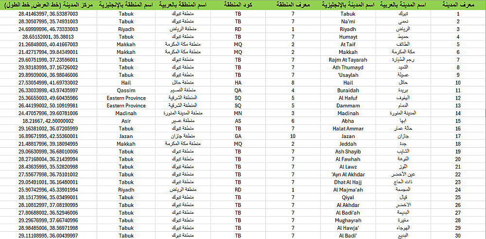 معرف المدينة - اسم المدينة بالعربية - اسم المدينة بالإنجليزية - معرف المنطقة - كود المنطقة - اسم المنطقة بالعربية - اسم المنطقة بالإنجليزية - مركز المدينة (خط العرض, خط الطول) .
