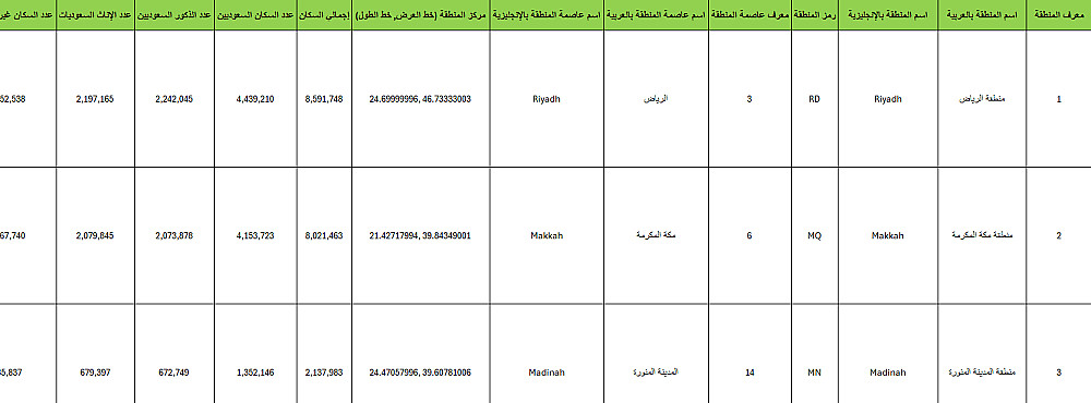 إجمالي السكان في كل منطقة - عدد السكان السعوديين - عدد الذكور السعوديين - عدد الإناث السعوديات - عدد السكان غير السعوديين - عدد الذكور غير السعوديين - عدد الإناث غير السعوديات .