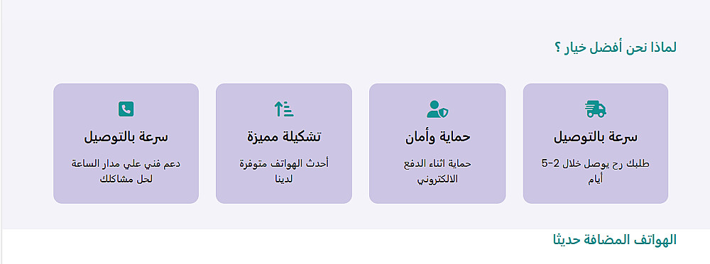 قسم خدمات يوضح أهم المميزات والخدمات التي يقدمها الموقع (مثل الشحن السريع، الضمان، دعم العملاء).