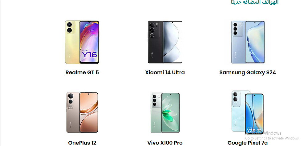قسم منتجات تعرض فيه أحدث الموبايلات المتوفرة بشكل منظم وجذاب مع تفاصيل مختصرة لكل منتج (صورة، اسم الموبايل، السعر).