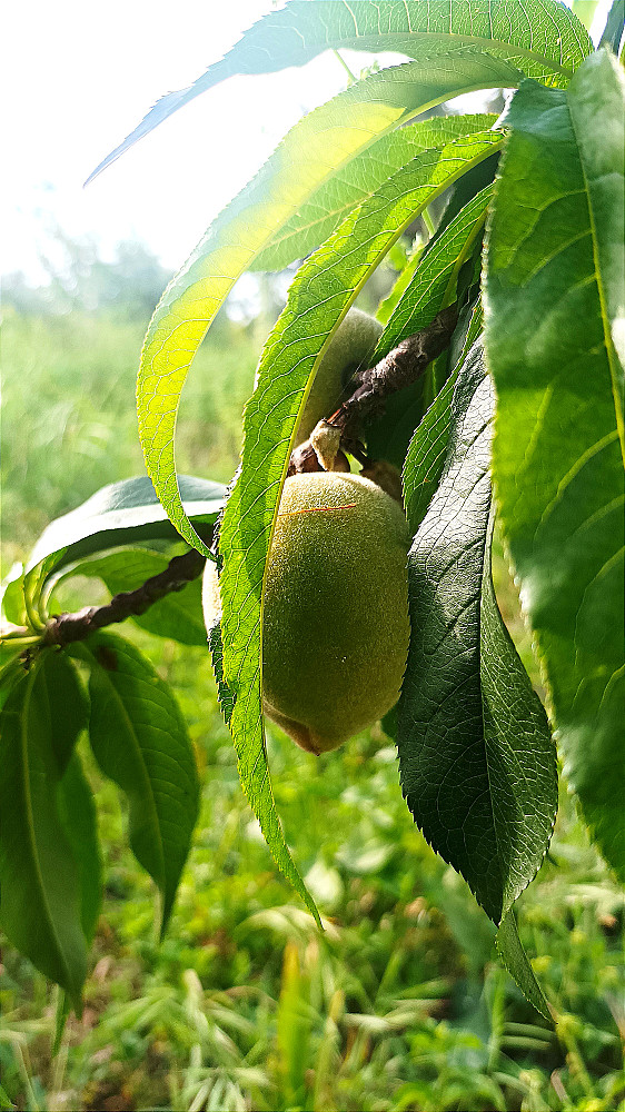 توثيق فوتوغرافي يعرض مراحل نمو ثمرة الخوخ في بيئتها الطبيعية. تُظهر الصورة الأولى الخوخ في بدايات تكوينه، بلونه الأخضر وملمسه الزغبي، بينما تُبرز الصورة الثانية اقتراب نضجه بلونه الأحمر اللامع وتغير شكل القشرة. الصور ملتقطة بإضاءة طبيعية وسط أوراق خضراء تمنح المشهد طابعاً حيوياً وزراعياً أصيلاً.