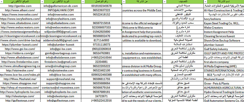 - أقدم لكم في هذه الخدمة قاعدة بيانات شركات في الكويت بمختلف التصنيفات مع ارقام التواصل والايملات.