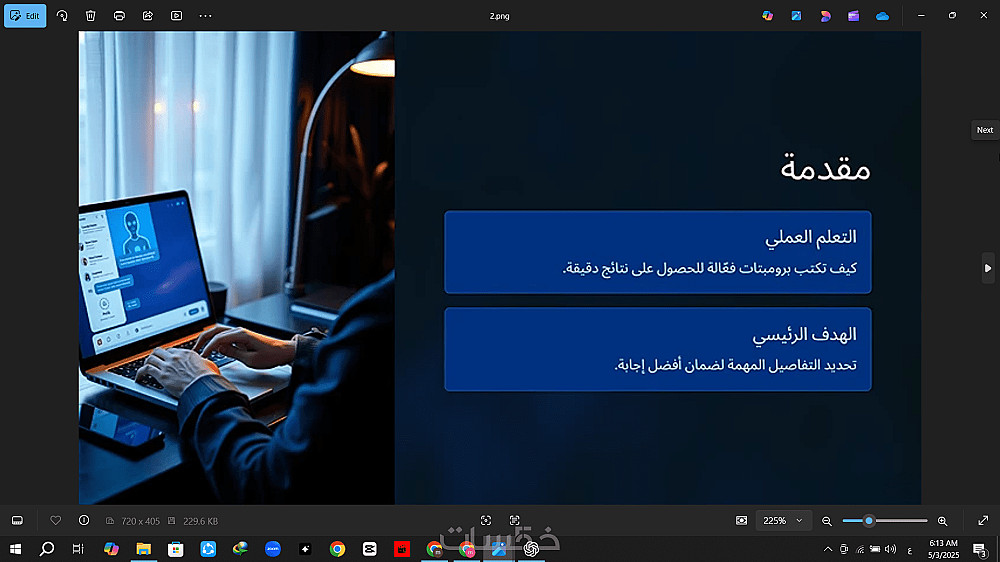 هذه المحاضرة مصممة خصيصًا لتزويدك بأساس قوي في كيفية التفاعل بذكاء مع نماذج الذكاء الاصطناعي مثل ChatGPT من خلال كتابة برومبتات فعالة، احترافية، ومخصصة حسب مجالك أو مشروعك، حتى لو لم تكن لديك أي خبرة سابقة.