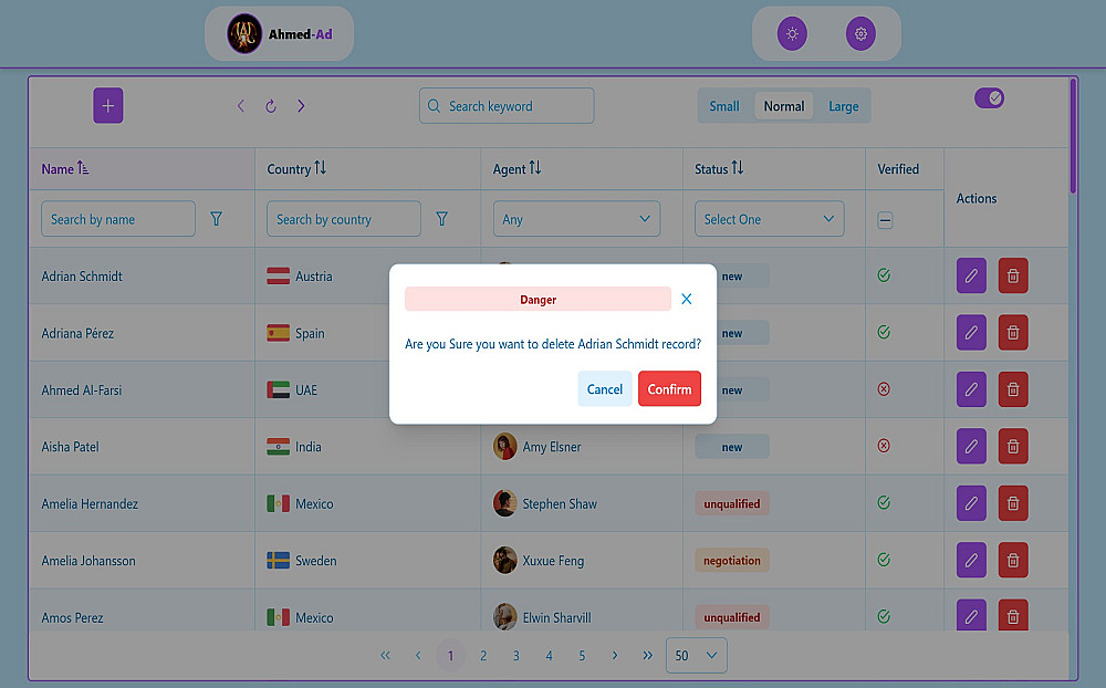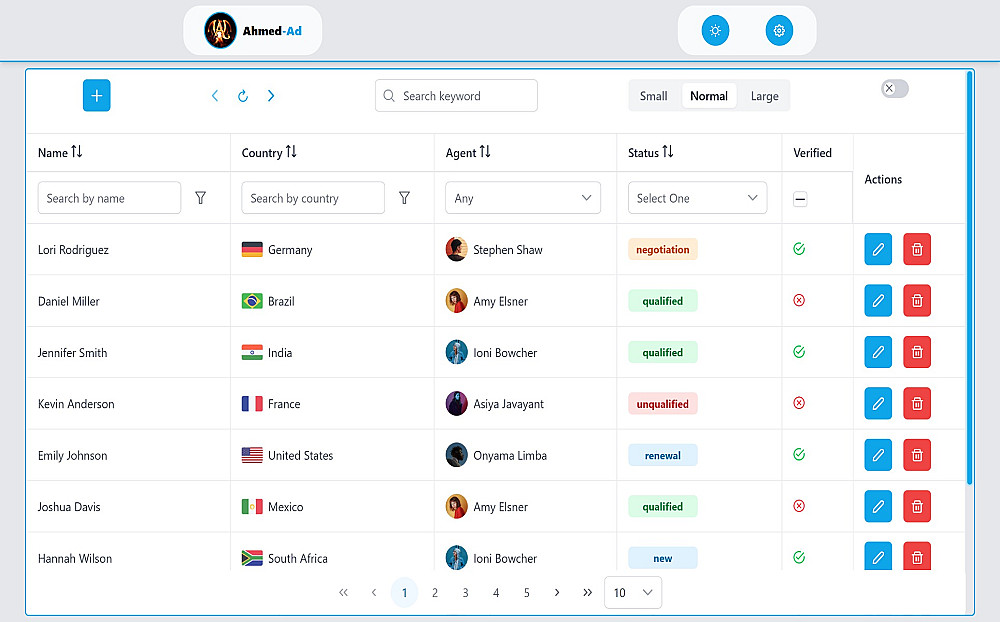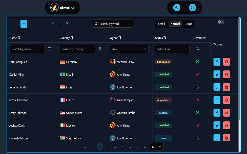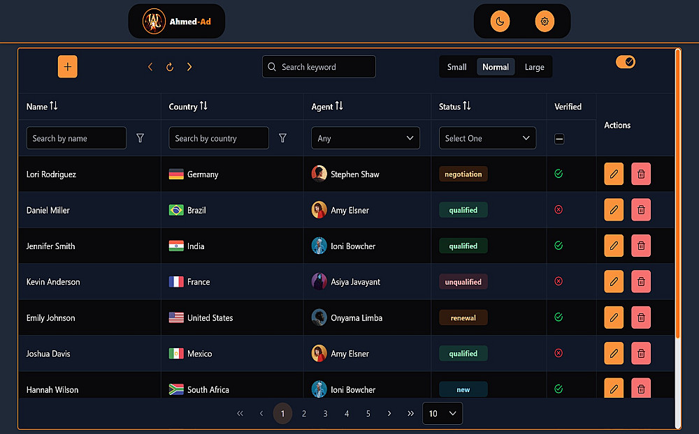 🔍 نظام تصفية وبحث متقدم: بحث شامل عبر الحقول، مع دعم للفلاتر المتعددة مثل الدولة، الحالة، التحقق، والممثل.