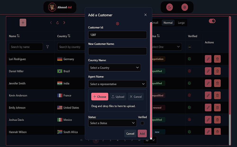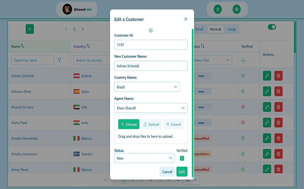 Data View هو مشروع ويب احترافي تم تطويره باستخدام Angular وPrimeNG مدعومًا بتصميم عصري ومرن عبر TailwindCSS. يهدف المشروع إلى توفير واجهة مستخدم سهلة الاستخدام لعرض وإدارة البيانات بطريقة تفاعلية وسلسة، مما يجعله مثاليًا لتطبيقات إدارة العملاء أو أي نظام يعتمد على CRUD.