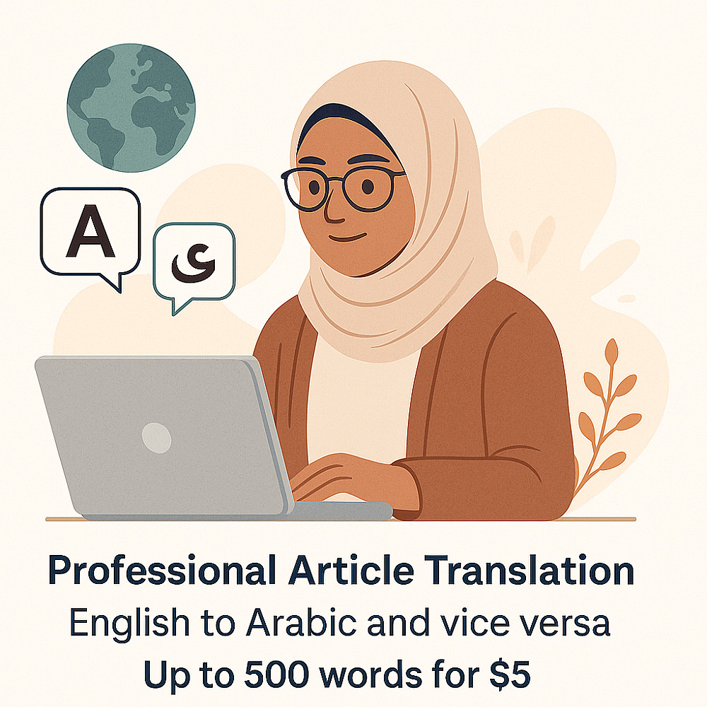 أنا أقدم ترجمة احترافية ودقيقة للمقالات والأبحاث من العربية إلى الإنجليزية والعكس، مع مراعاة الحفاظ على المعنى والأسلوب الأصلي.