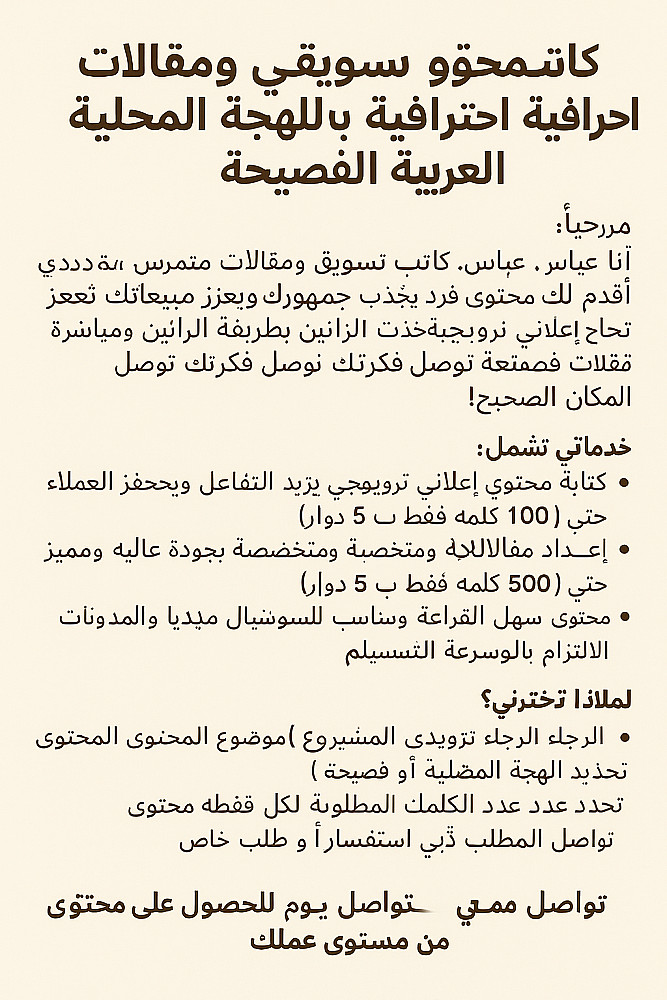سواء كنت تحتاج إعلانات ترويجية باللهجة المحلية تجذب الزبائن بطريقة بسيطة ومباشرة، أو مقالات فصيحة ومقنعة توصل فكرتك بوضوح، فأنت في المكان الصحيح!