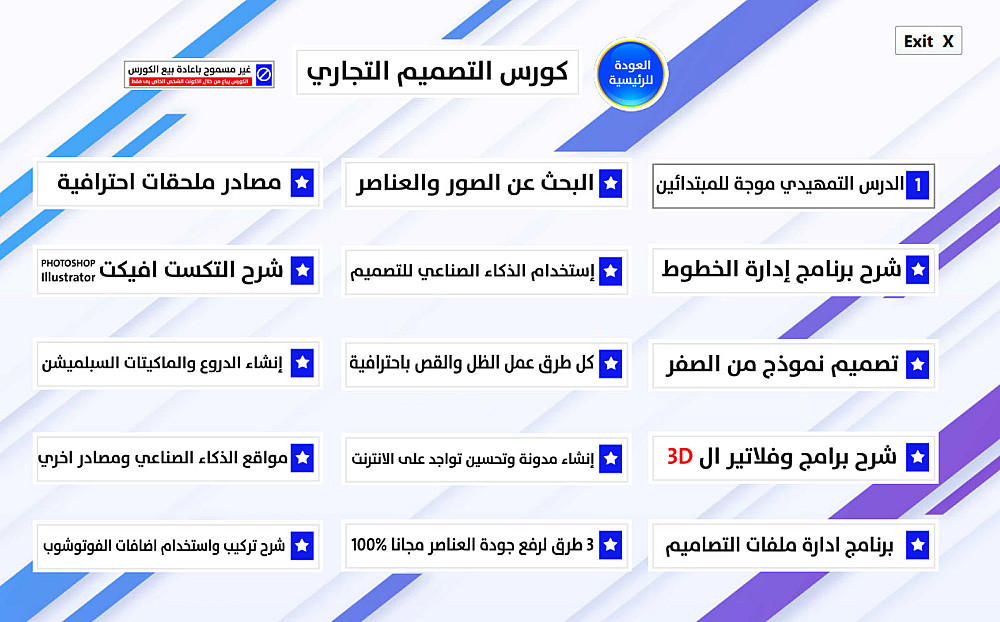 كورس التصميم التجاري عدد ساعات الكورس 10 ساعات 15 فيديو دروس حجم الكورس 23 جيجا جودة عرض الفيديوهات 2K جودة QHD مستوي الكورس من مبتداء الى مستوي اعلى من المتوسط من 1 الى 7 من تقيم 10 محترف سعر الكورس 15 دولار