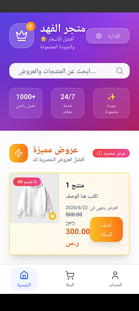 هل ترغب في بدء مشروع ربحي مثل "طلبات" أو "نون" دون خبرة برمجية؟ أقدم لك تطبيق متجر إلكتروني احترافي متعدد التجار، جاهز للتشغيل والربح فورًا، يمكن لأي تاجر حجز مساحة داخل التطبيق لعرض منتجاته. التطبيق يدعم إضافة منتجات، طلبات، عملاء، وإشعارات فورية.
