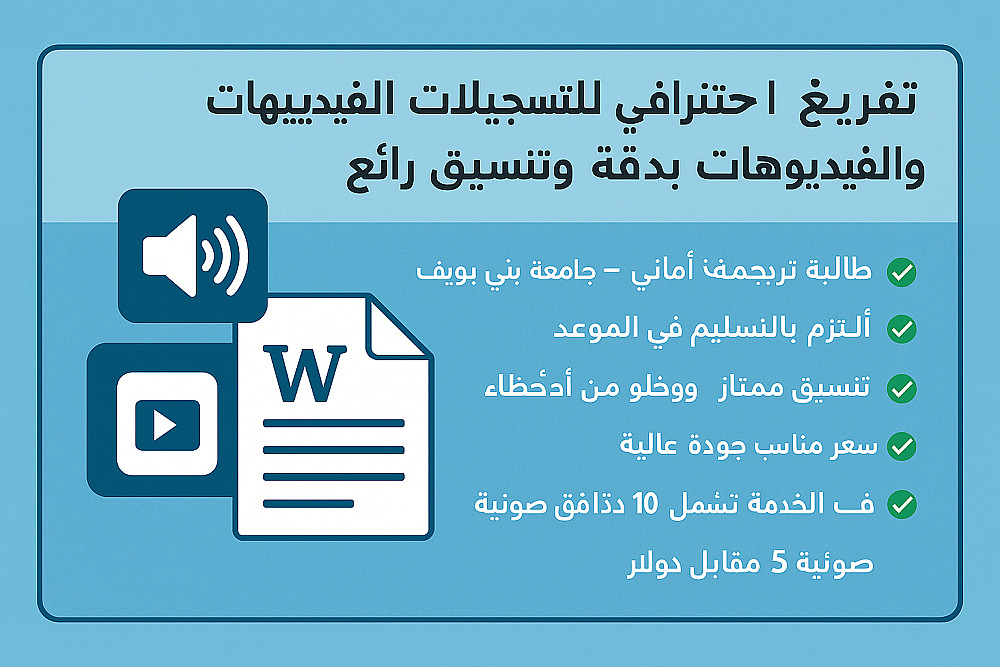 سأقوم بتفريغ التسجيلات الصوتية أو الفيديوهات باللغة العربية ( محاضرات ، دروس ،مقابلات ، بودكاست ...) بدقة لغوية و احترافية في ملف word منسق و منظم