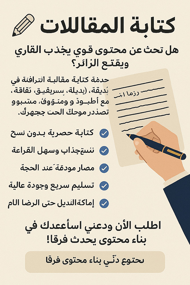 🔹 الضمان: خلوّ المقال من أي سرقة أدبية (بنسبة 100٪) + مراجعة مجانية بسيطة بعد التسليم.
