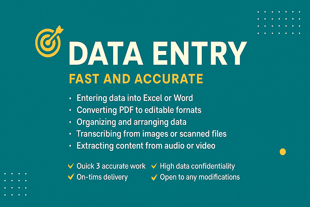 أنا متخصص في إدخال البيانات وتحويلها من أي مصدر (ورقي – إلكتروني – صوتي) إلى صيغة رقمية منظمة، مع التركيز على التفاصيل ومراعاة قواعد التنسيق والكتابة الاحترافية.