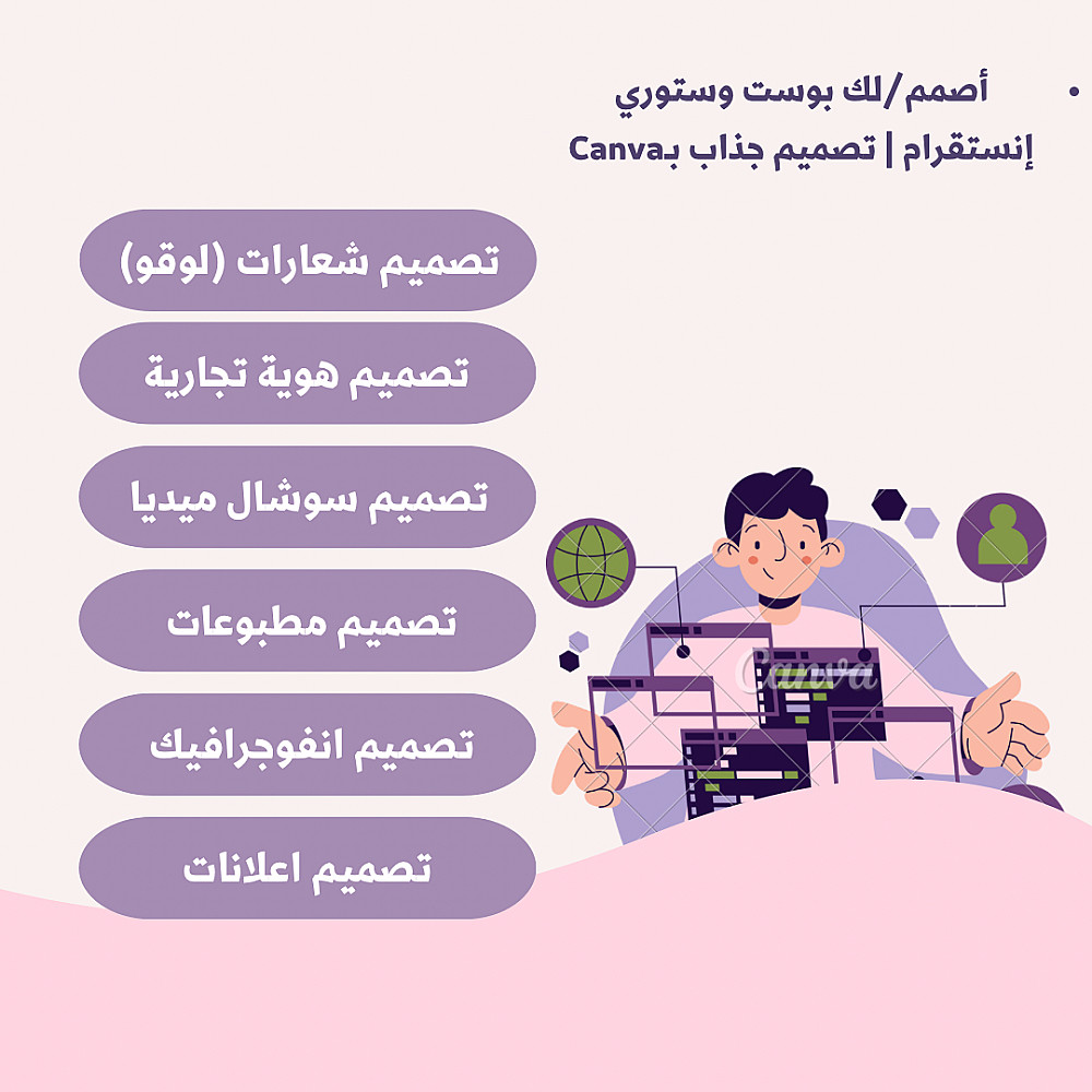 أقدم لك تصميم مميز باستخدام Canva، سواء بوست أو ستوري، او اي شي تبيه . يناسب متجرك أو حسابك أو مشروعك.