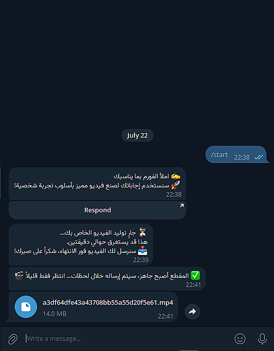 سأقوم بتسليمك نظام آلي (Workflow) جاهز بالكامل باستخدام n8n وAI لتوليد محتوى فيديو بأسلوب تجربة المستخدم، يمكن تشغيله بضغطة زر، وإدخال البيانات من خلال Telegram أو فورم.