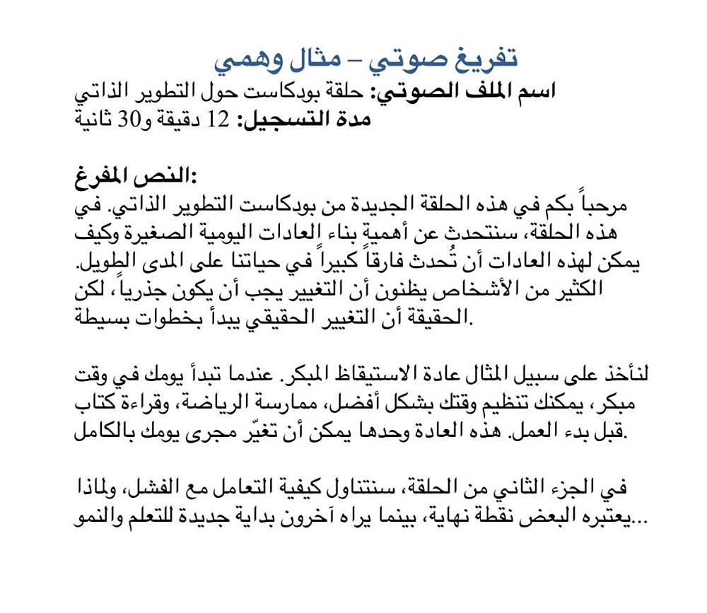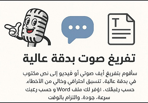 أقدم لك خدمة تفريغ صوتي احترافية باللغة العربية (الفصحى أو العامية) لأي نوع من الملفات: