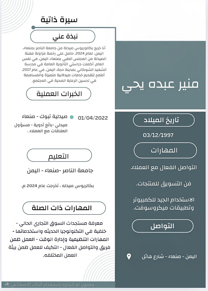 القيام بإنشاء وتصميم سيرة ذاتية مهنية مميزه بناء على المعلومات التي يتم تقديمها من طالب هذه الخدمه. يتم تقديم السيرة الذاتية باللغتين العربيه والإنجليزية بناء على طلبكم.