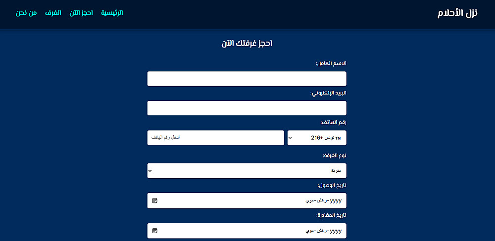 ✅ يشمل نموذج حجز متكامل مع اختيار نوع الغرفة وتواريخ الإقامة ورمز الدولة لرقم الهاتف