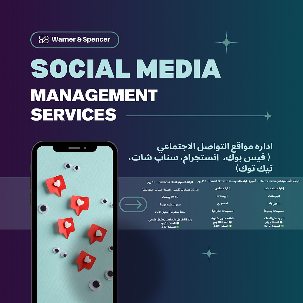 سأقوم بإدارة حساباتك على منصات التواصل (فيسبوك، إنستجرام، سناب شات) بطريقة احترافية تساعد على تعزيز وجودك الرقمي، وجذب المتابعين والعملاء المحتملين.