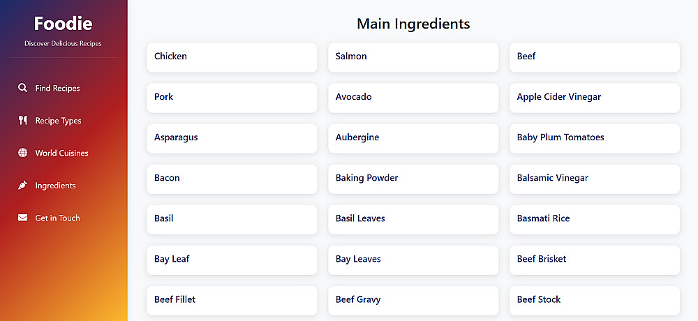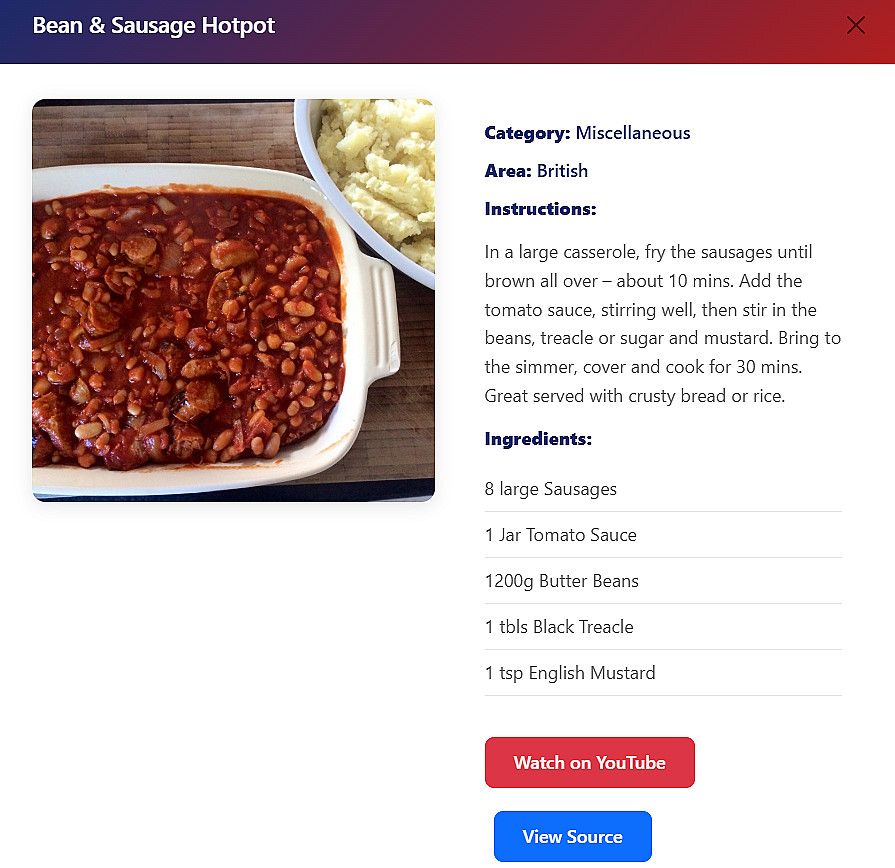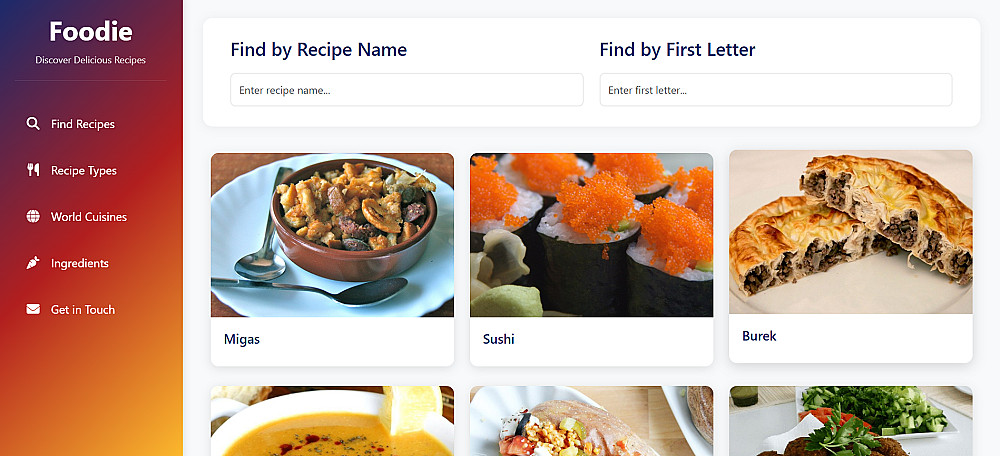 الصفحة الرئيسية (Home): عرض وصفات من TheMealDB API + محرك البحث.