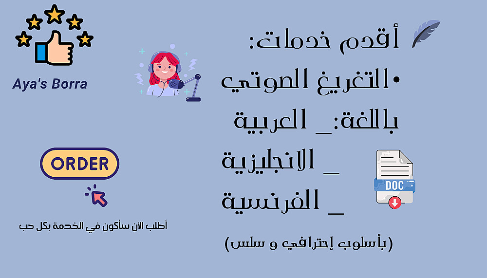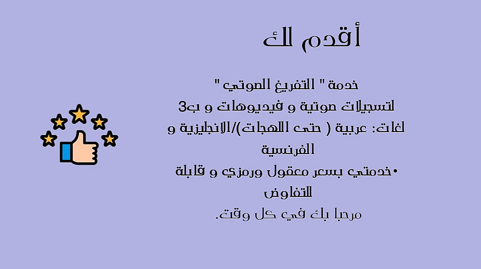 أجيد التفريغ بثلاث لغات العربية ( الفصحى/اللهجات العربية)، الإنجليزية و الفرنسية، و أضمن تنسيقا واضحا وخاليا من الأخطاء الإملائية و النحوية.