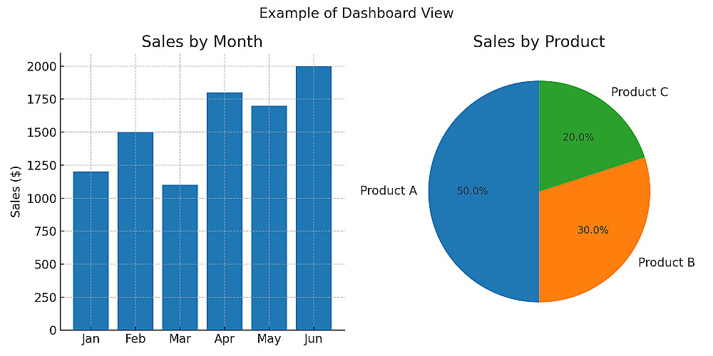 لوحة بيانات مريحة للقراءة وسهلة للفهم تحتوي تمثيل بياني دائرة بيانية + أعمدة بيانية تمثل الأرباح في الشهر الواحد والمبيعات كل شهر