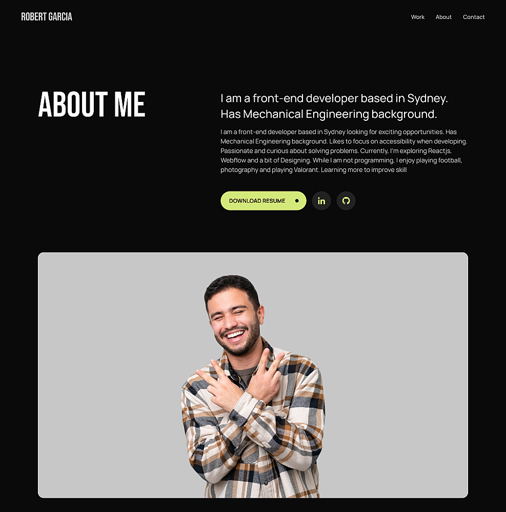 موقع بورتفوليو شخصي احترافي صفحة واحدة متجاوبة مع 6 أقسام أساسية.