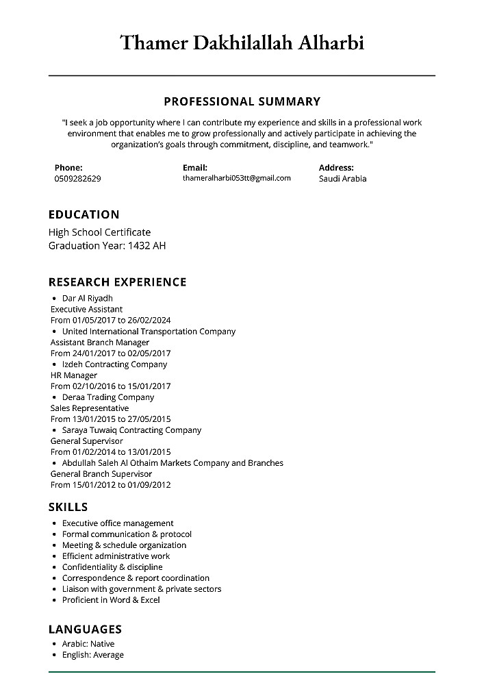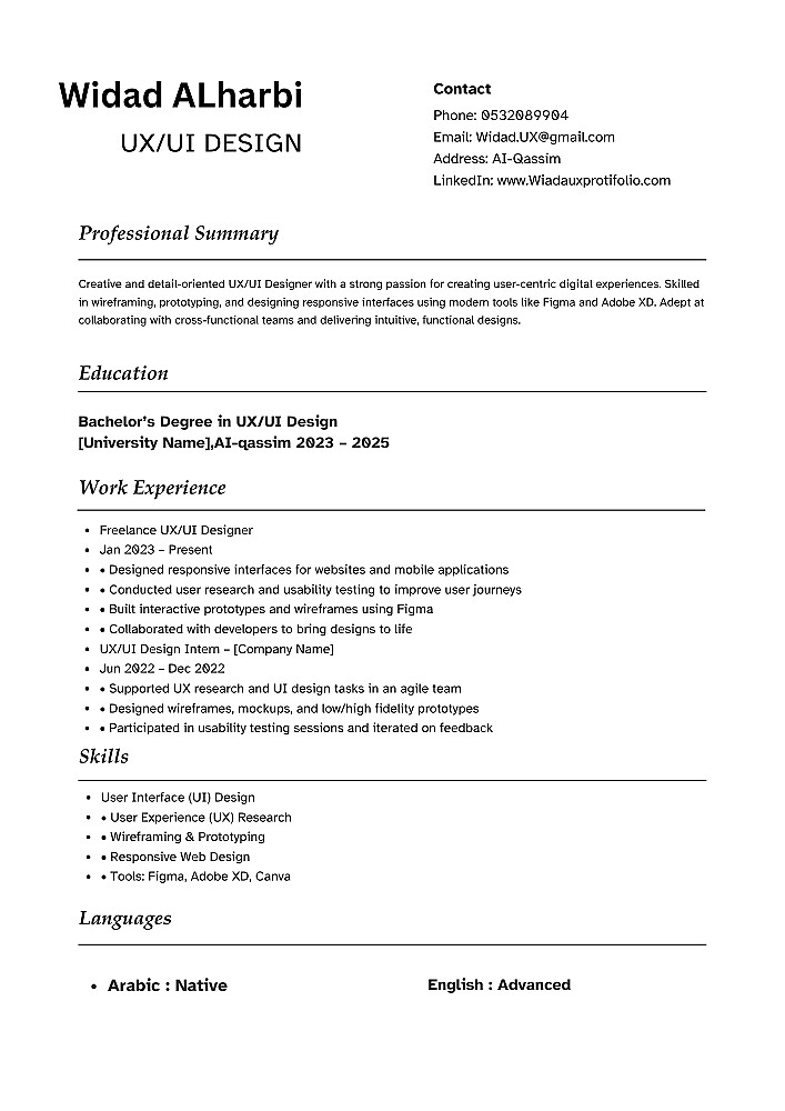 أنا وداد الحربي، مصممة UX/UI وGraphic Designer، سأقوم بتصميم سيرة ذاتية تناسب سوق العمل الحديث وتكون ATS-Friendly لتزيد فرص قبولك في الوظائف.