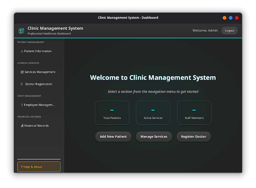 3- Dashboard احترافيه لأداره العياده ويخبرك بكل الاطباء والمرضى والعمال المسجلون في النظام والخدمات الطبيه المتاحه