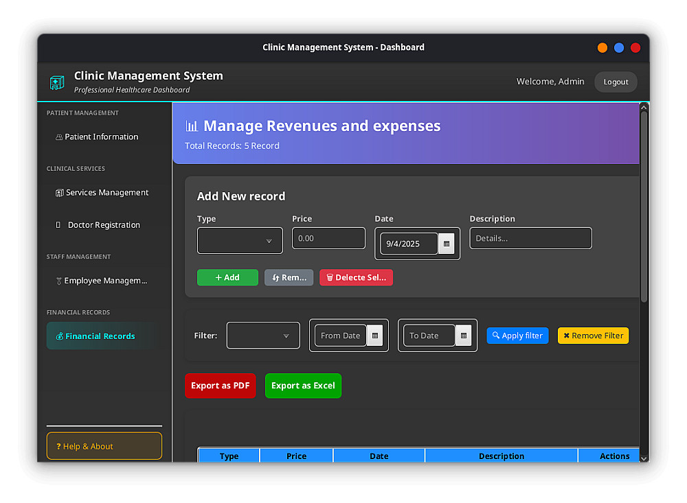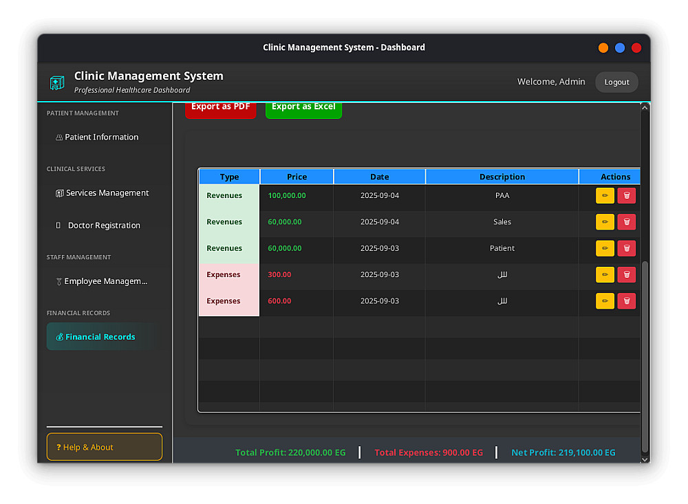 8-قسم Financial Record لتسجيل الايرادات والمصروفات وتحديد حاله العياده ان كانت رابحه ام خاسره مع امكانيه تصدير التقرير كPDF او EXCEL CSV مع فلتر للبحث
