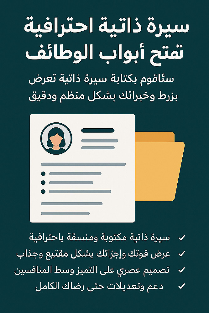 سأقوم بكتابة سيرة ذاتية احترافية تُبرز مهاراتك وخبراتك بشكل منظم ودقيق، مع تنسيق أنيق يجعل سيرتك جاهزة للعرض فورًا.
