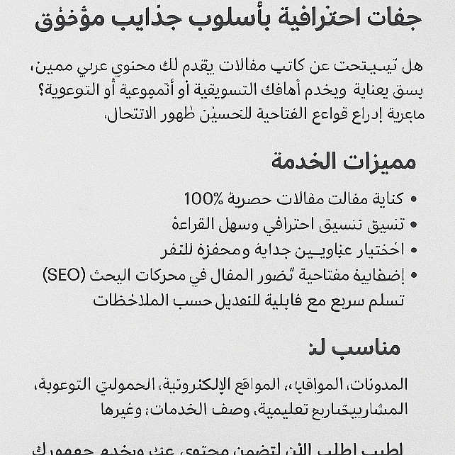 💡 اطلب الآن لتضمن محتوى يعبّر عنك ويخدم جمهورك بأفضل صورة.