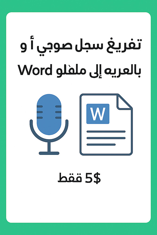 > سأقوم بتفريغ أي تسجيل صوتي أو فيديو باللغة العربية (محاضرات – مقابلات – ملاحظات – دردشات صوتية) وتحويله إلى نص مكتوب بصيغة Word أو PDF.