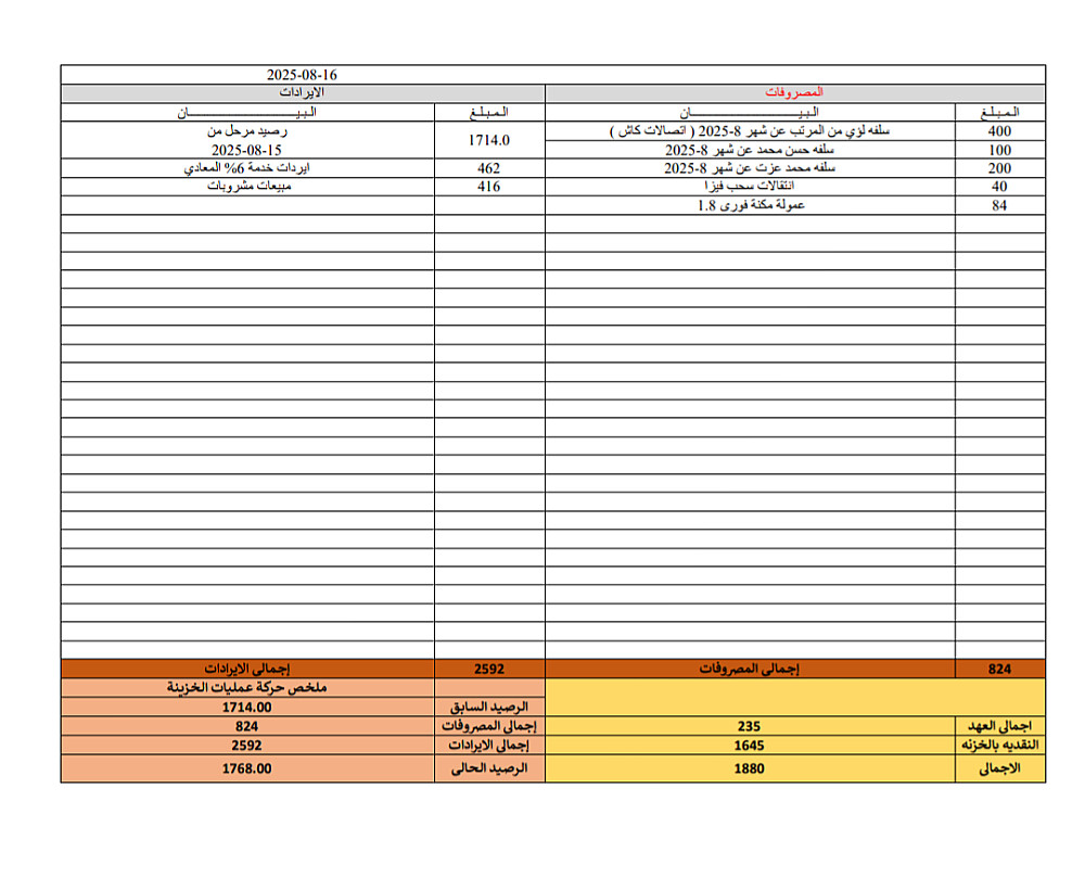 أنا أقدم لك خدمة إعداد بيان خزنة احترافي يساعدك على تتبع أموالك بسهولة ووضوح، مع فيديو تعليمي خاص يشرح لك كيفية استخدام البيان خطوة بخطوة.