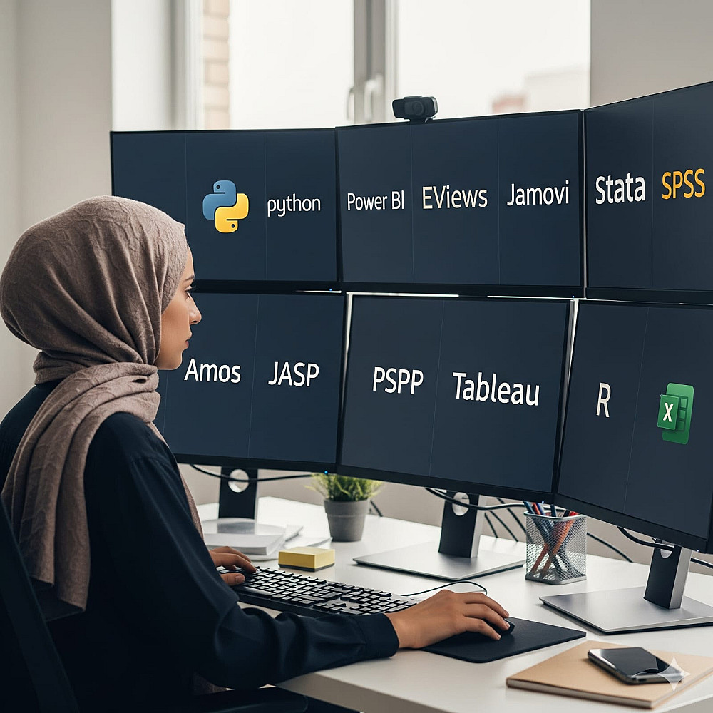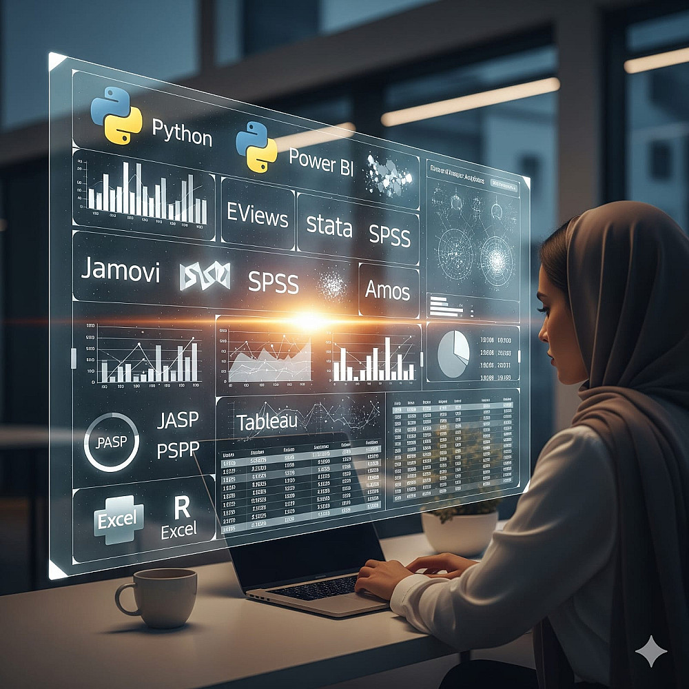 تحليل البيانات باستخدام برامج متقدمة: Python، Power BI، EViews، Stata، Jamovi، SPSS، Amos، JASP، PSPP، Tableau، R، Exce