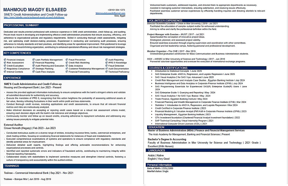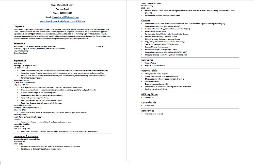 ملاحظة: إذا كنت تحتاج إلى ملف Word قابل للتعديل لسيرة ذاتية من صفحتين، يُرجى طلب الخدمة المخصصة لذلك.